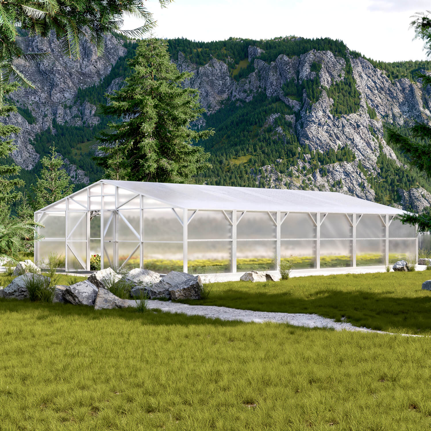 - Flexibla storlekar: Finns i bredder på 4 m, 6 m och 8 m, med längder från 4 m till 20 m. En höjd på 2,5 m och en väggshöjd på 1,98 m ger gott om plats för olika grödor.